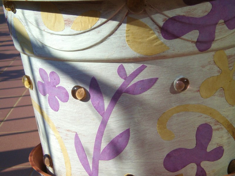 Vases and pots painted and decorated with decoupage technique and colored glass beads.