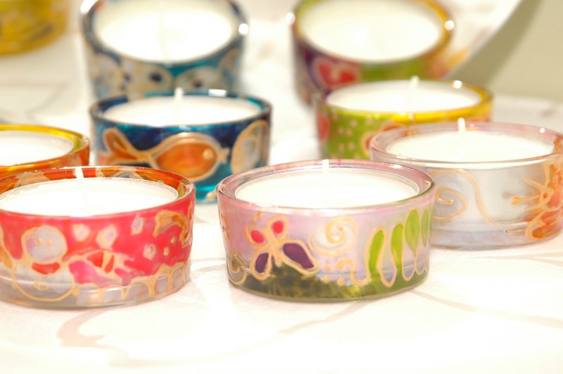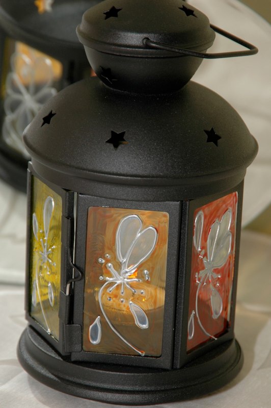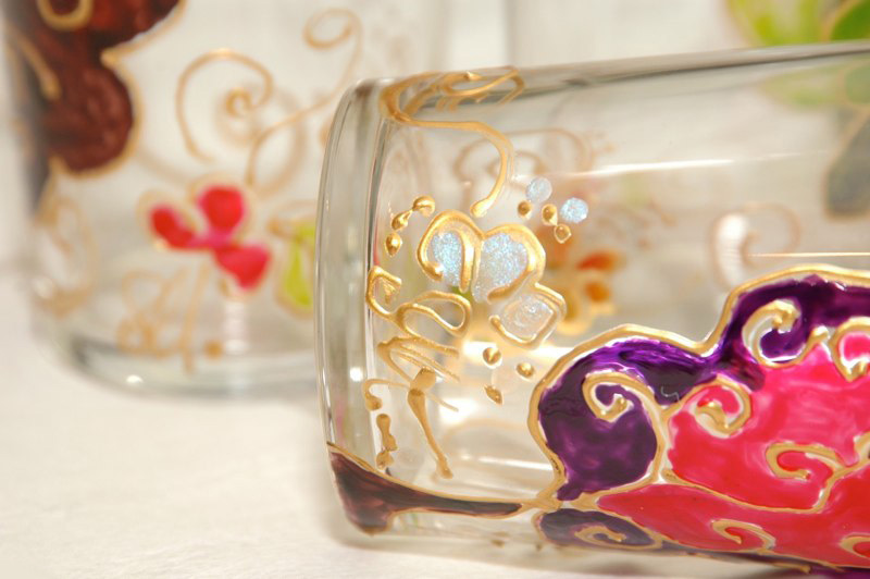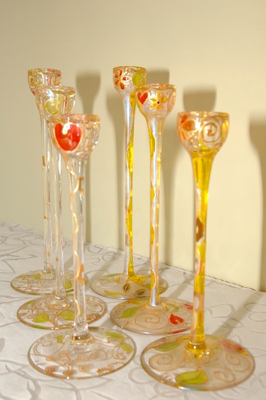 Small glass objects hand-painted with specific colous and lead paste. Different shapes and decorations. Windows and doors with floral decorations..